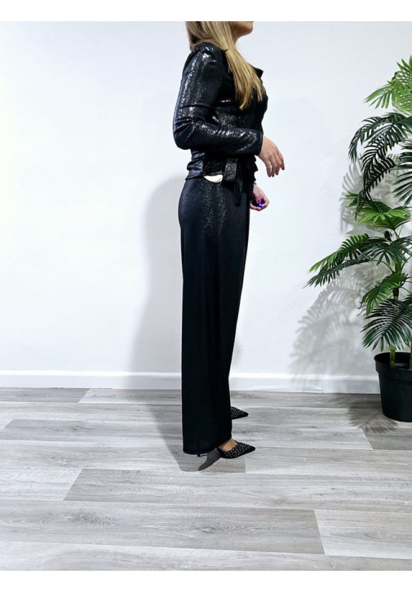 Conjunto de punto con brillo en negro de top con nudo lateral y pantalón con cintura de rizo. Talla única hasta una 40.