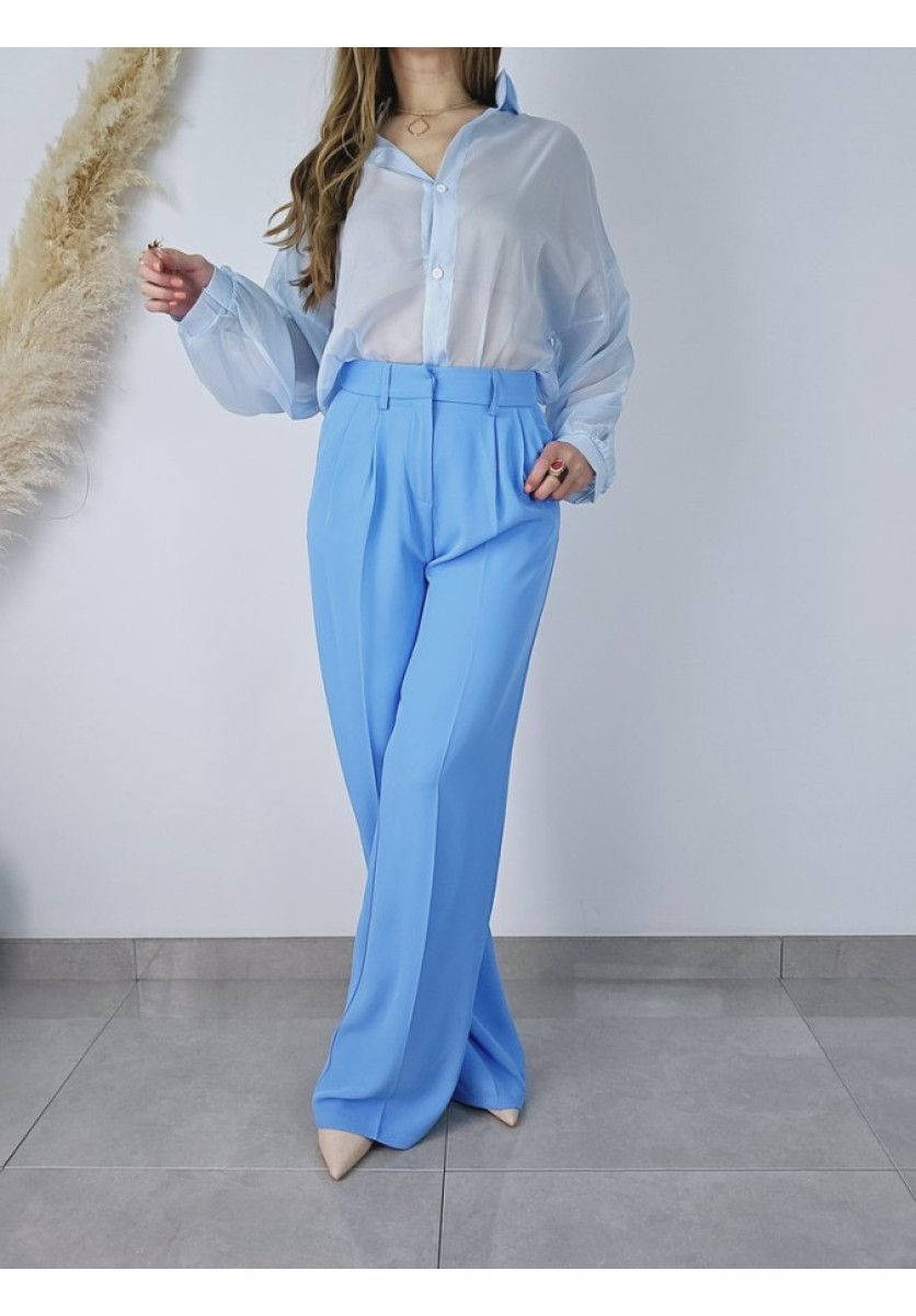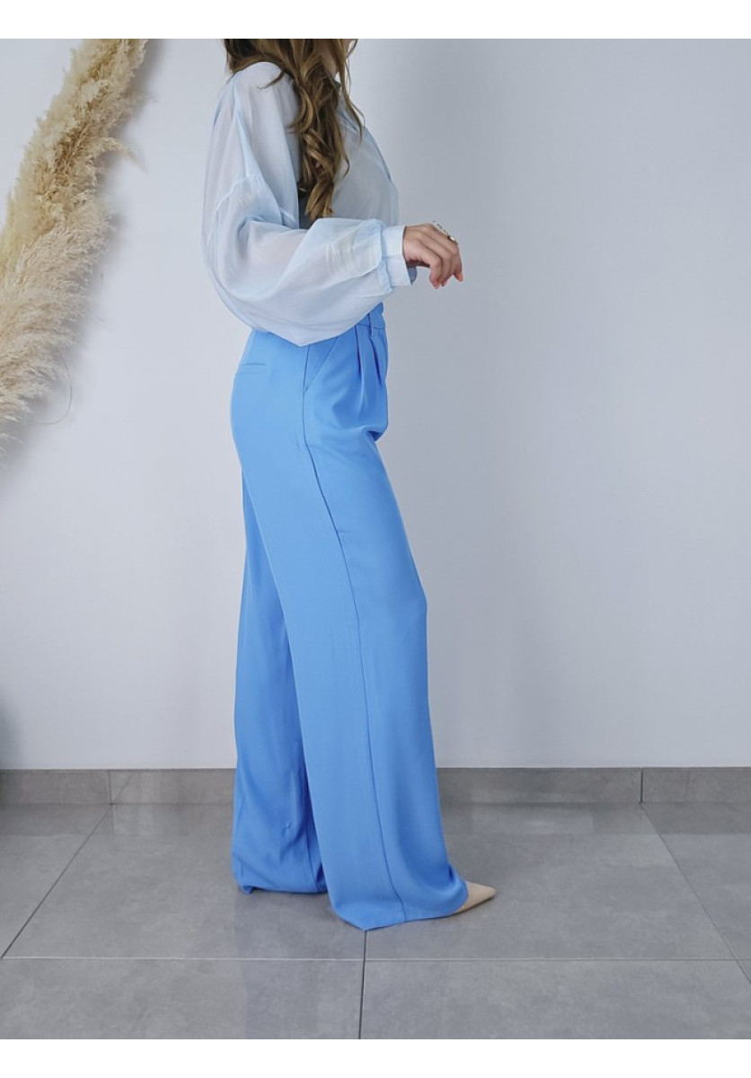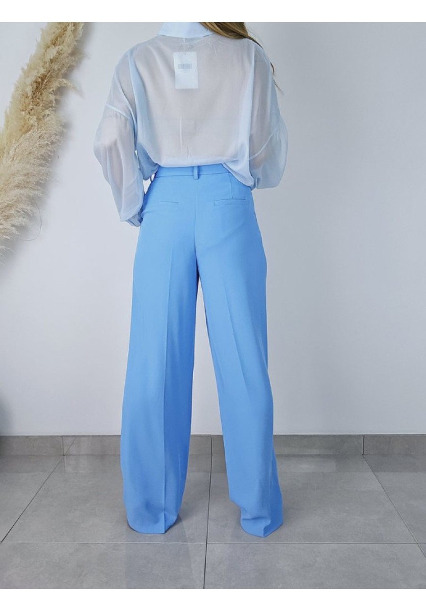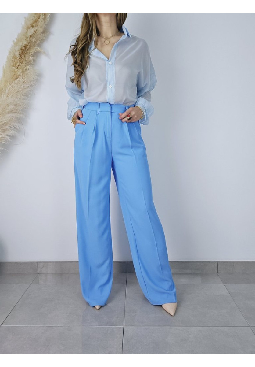 Pantalón ancho de vestir con pinzas. Tiene bolsillos delanteros. Su color no puede ser mas bonito en un azul cielo.