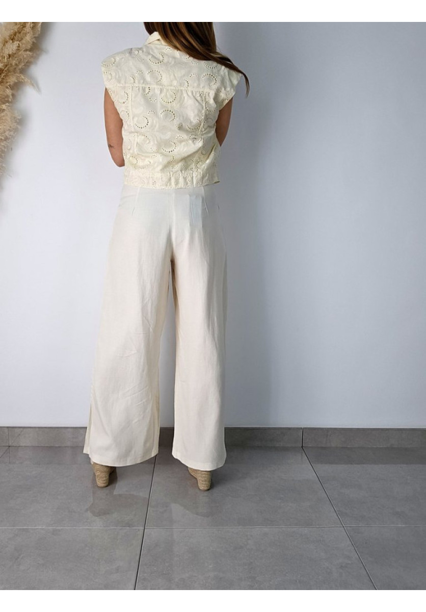 Pantalón de lino con algodón. Corte ancho y tablas delanteras. Tiene bolsillos y cierre por botón.