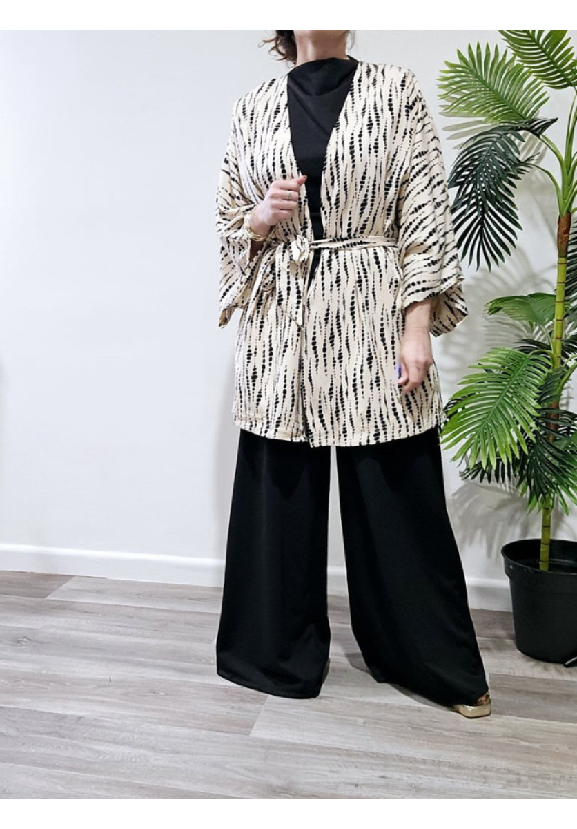 Casaca con cinturón en beige con manchas negras. Es oversice.