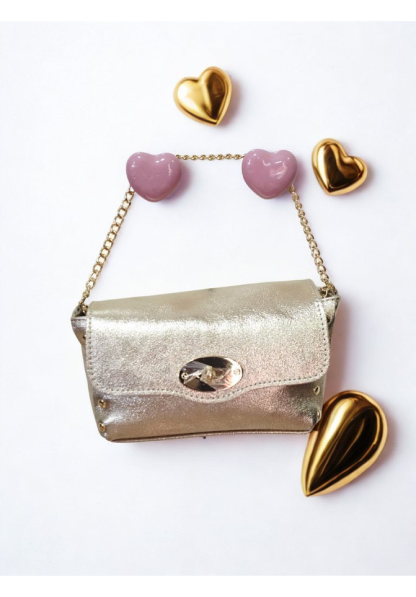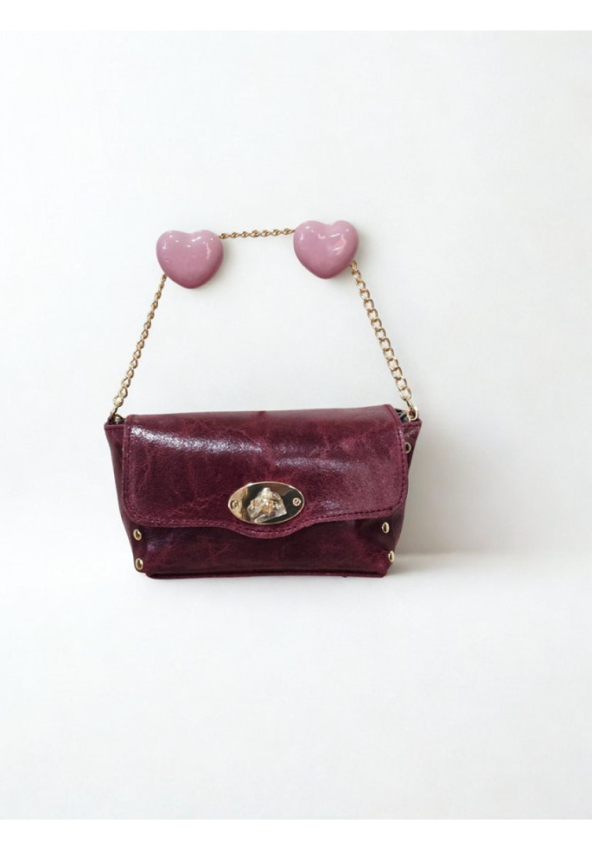 Bolso de tamaño pequeño fabricado en material sintético con acabado brillante y textura ligera. Incluye solapa frontal con cierre metálico giratorio y detalles decorativos en los laterales. Dispone de cadena metálica para llevar al hombro o cruzado y un compartimento interior para objetos esenciales.