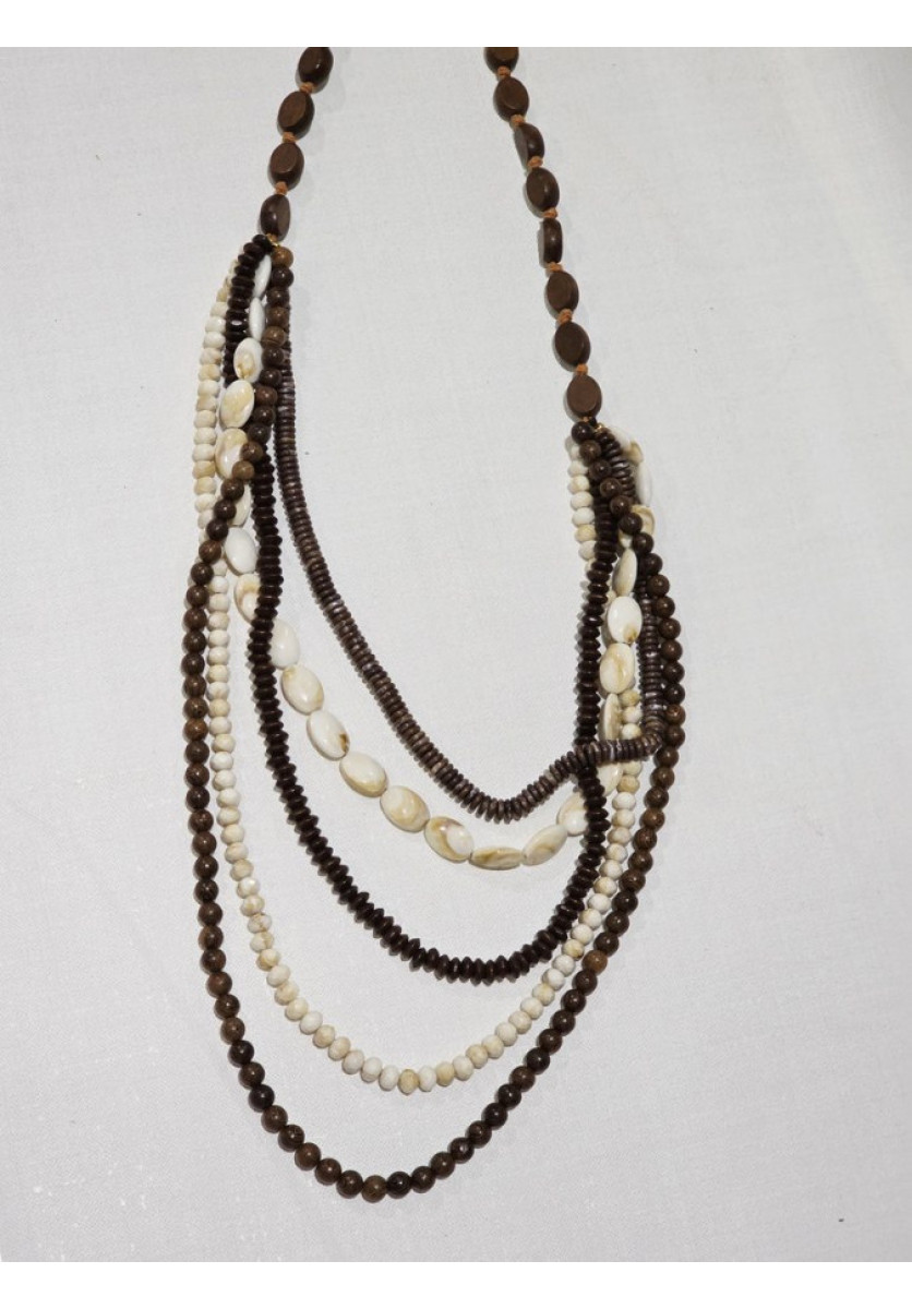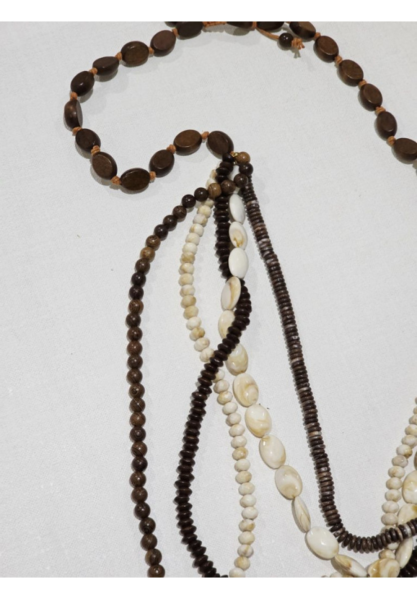 Collar largo con varias cadenas de naca y madera.