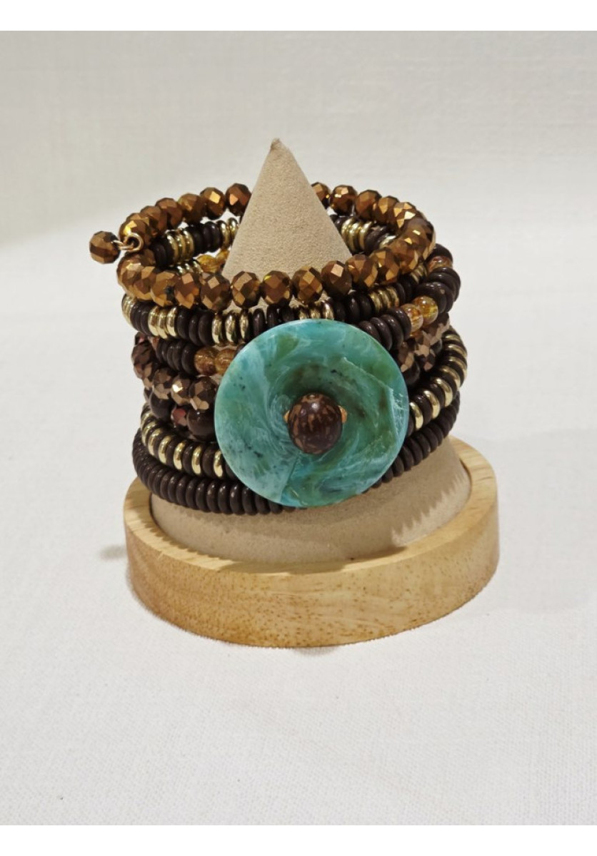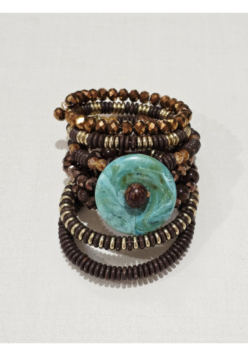 Pulsera tirabuzón con piedra verde. Madera y acero.