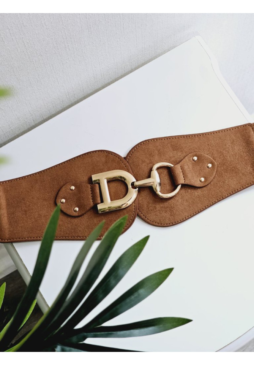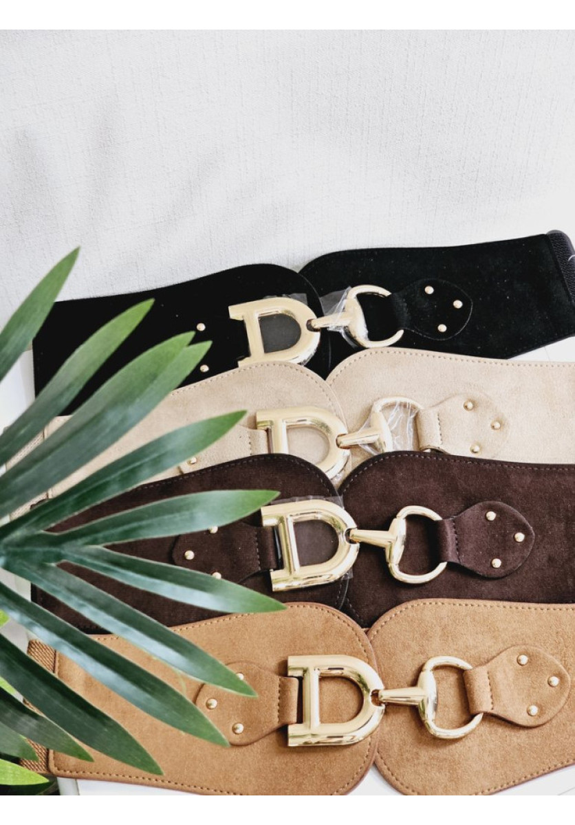 Cinturón tipo fajín de ante con adorno de acero dorado y parte trasera de elástico. Disponible en negro, beige, tauper y marrón.