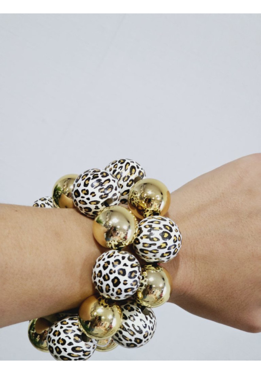 Pulsera de bolas en acero dorado y leopardo.