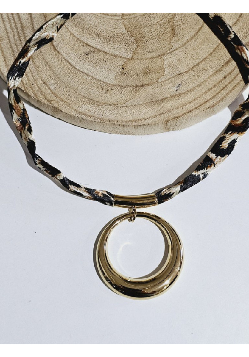 Collar con tela en leopardo y anilla redonda en acero dorado.