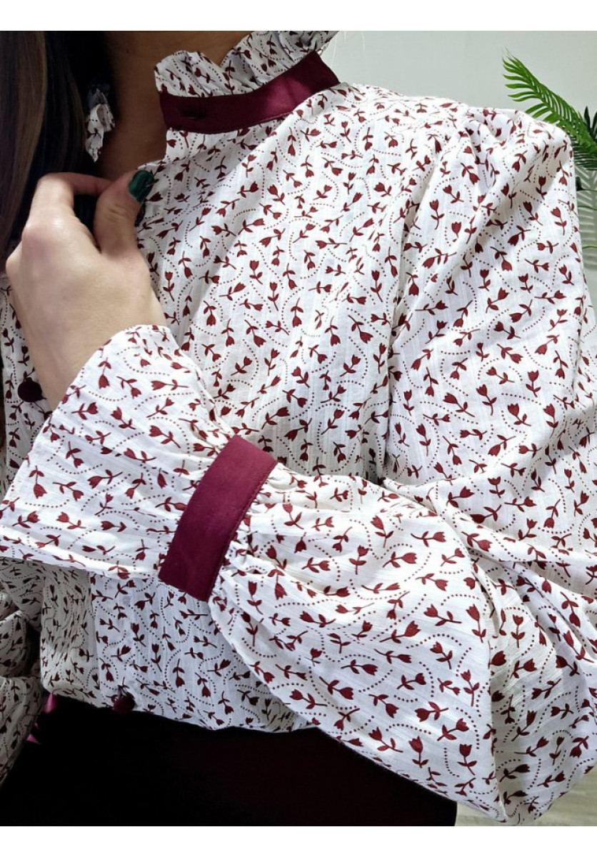 Camisa cuello mao con tira burdeos y vuelo. Estampada con florecitas en burdeos.