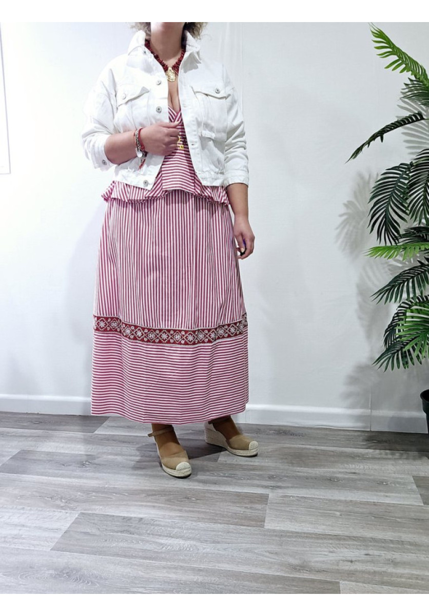 Conjunto en rojo de rayas blancas de top de tirantes con bordados y parte trasera de rizo. Falda de vuelo con bordados en el bajo y cintura de rizo.