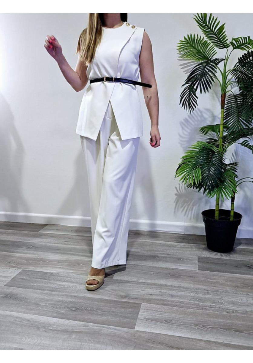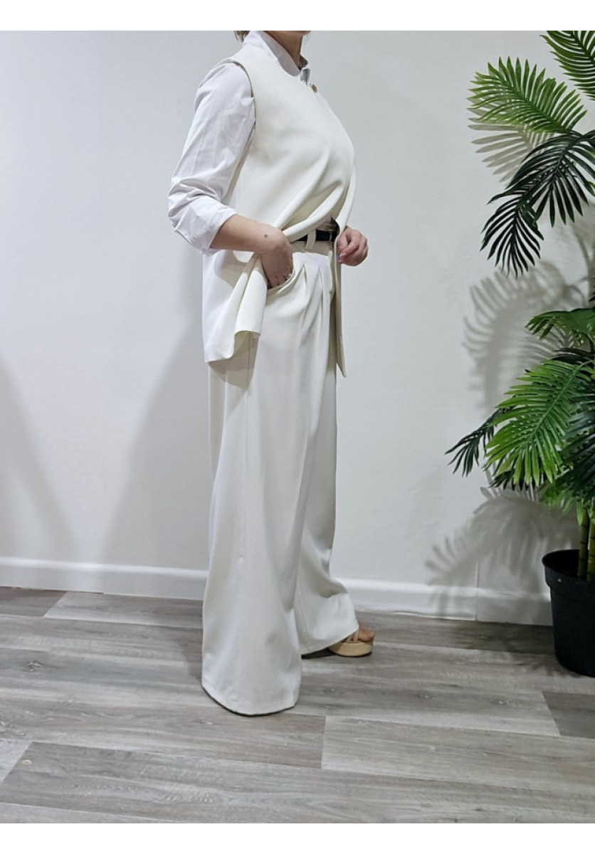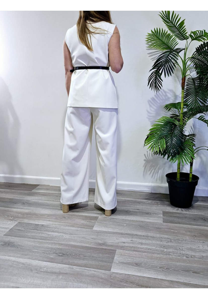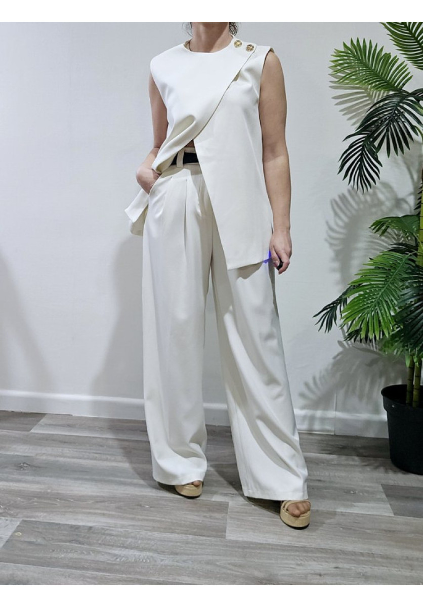 Conjunto de chaleco cruzado por delante con cierre en el hombro por botones y pantalón ancho con pinzas y cintura de elástico trasero y cierre por botón delantero. Tiene bolsillos. Lleva cinturón.