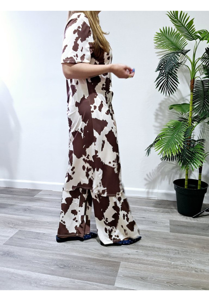 Conjunto de licra fría con estampado de vaca. Camiseta larga con nudo y abertura en el bajo y pantalón ancho con cintura elástica.