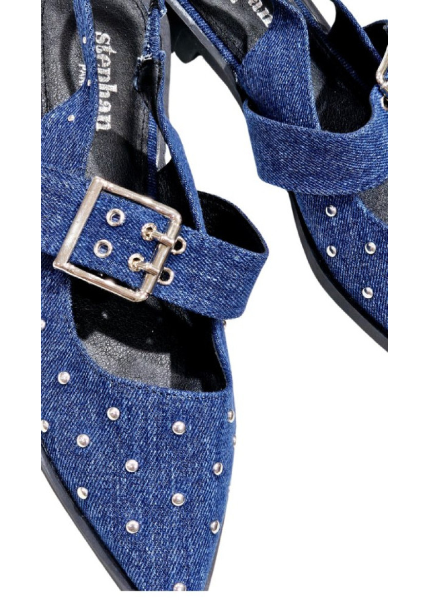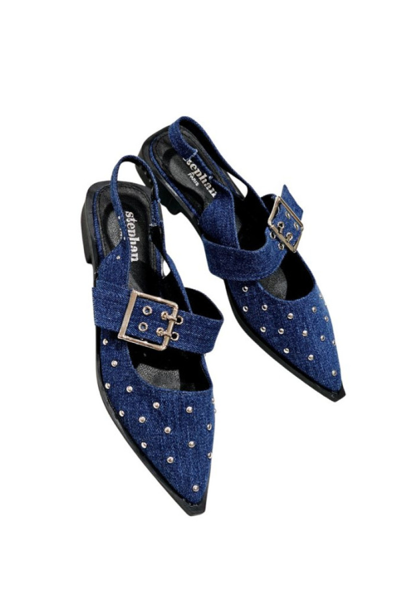 Mule plana en pico denin con tachuelas y hebilla decorativ en el empeine.