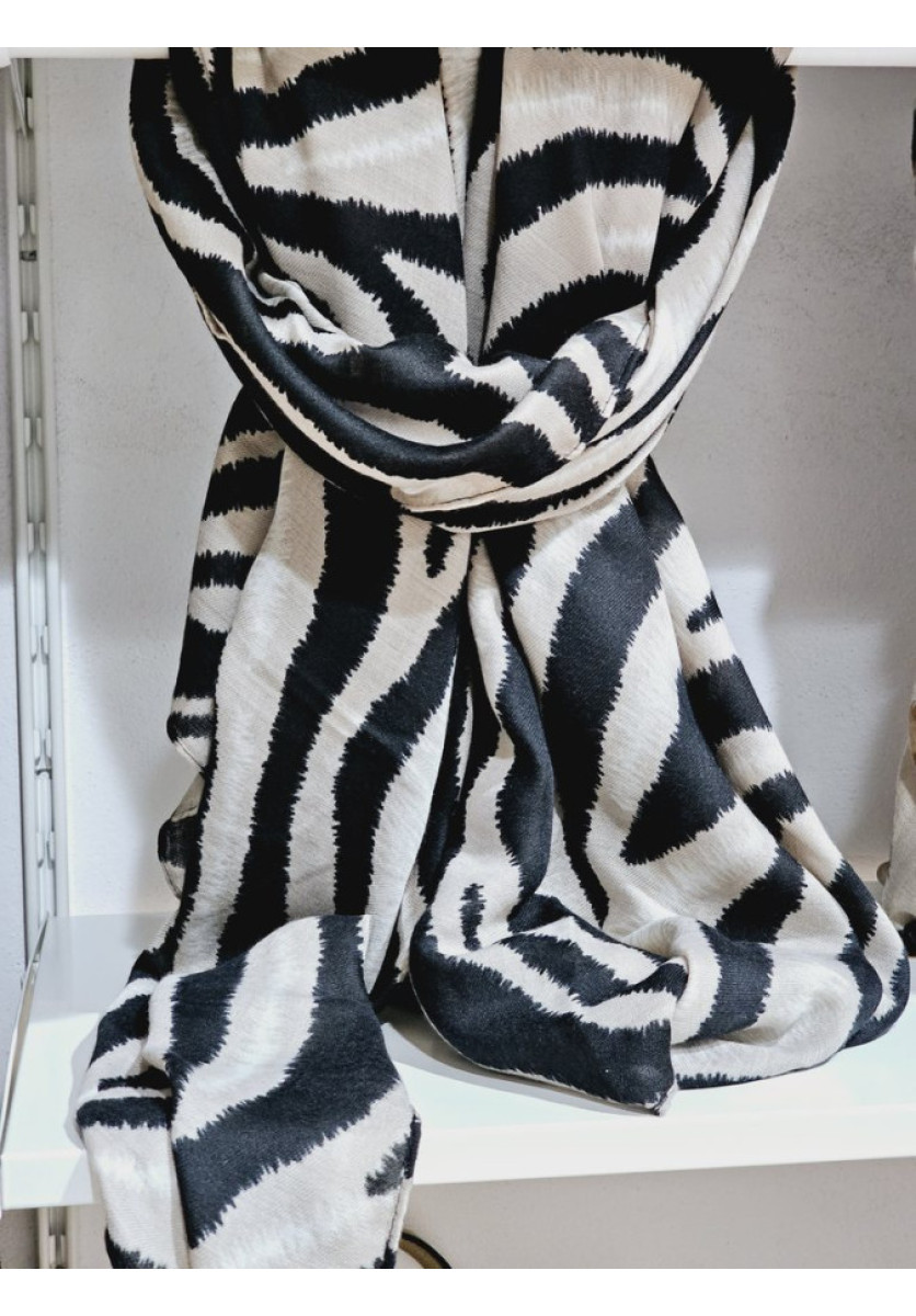 Pañoleta fular simulando cebra en tonos beige y negro.
