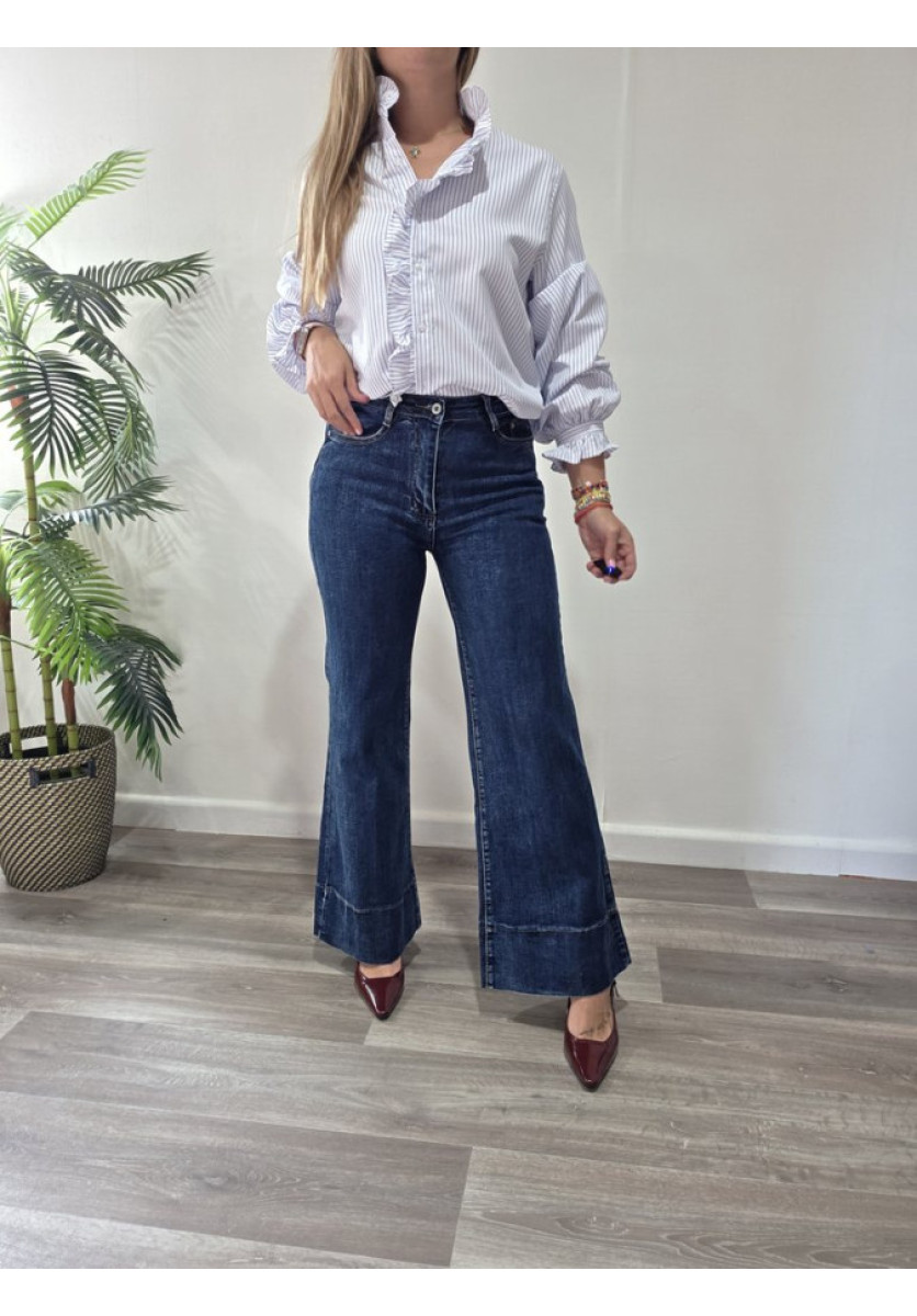 Camisa fondo blanco con rayas celeste. Manga larga y puntilla rizada en el cuello.
