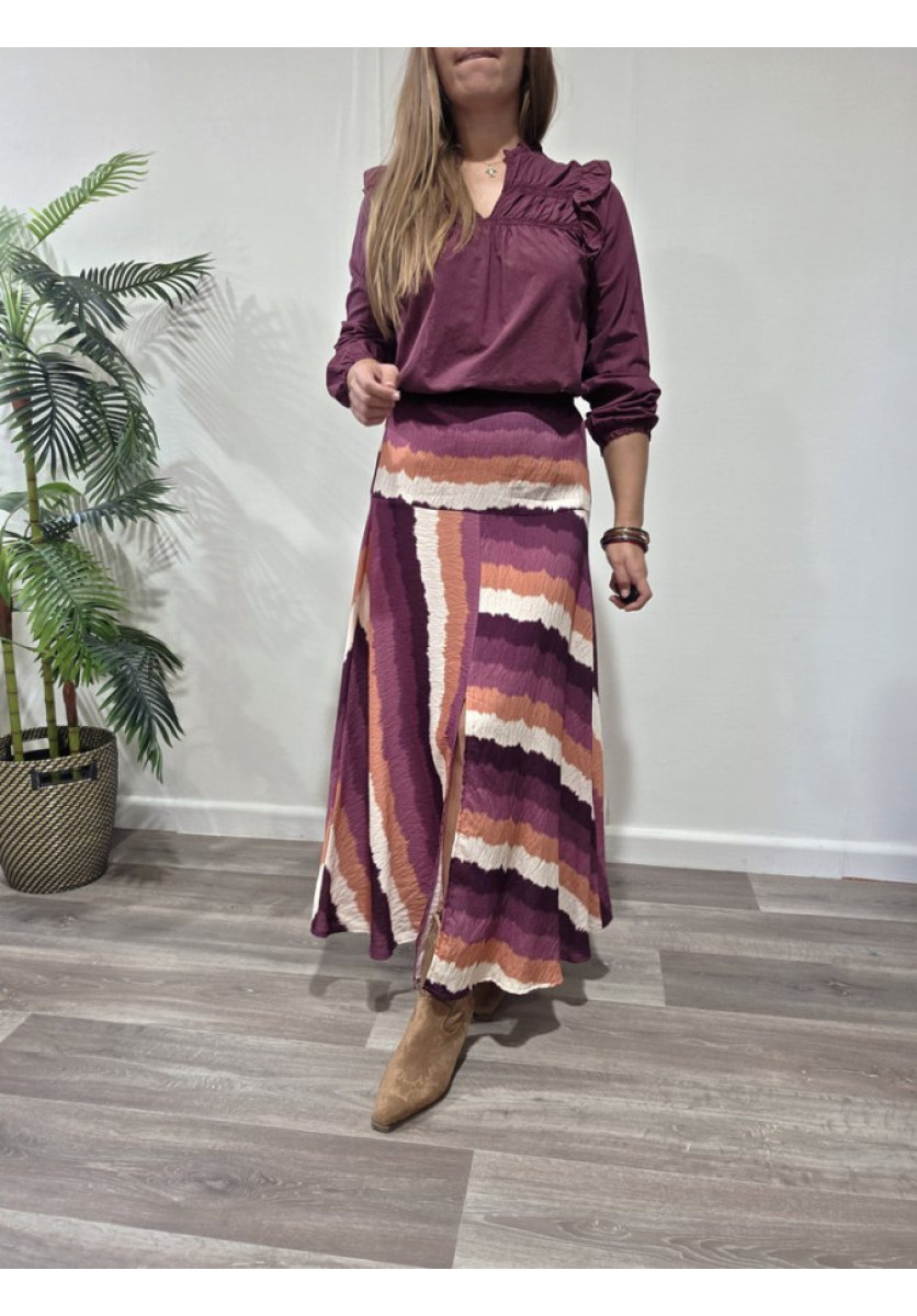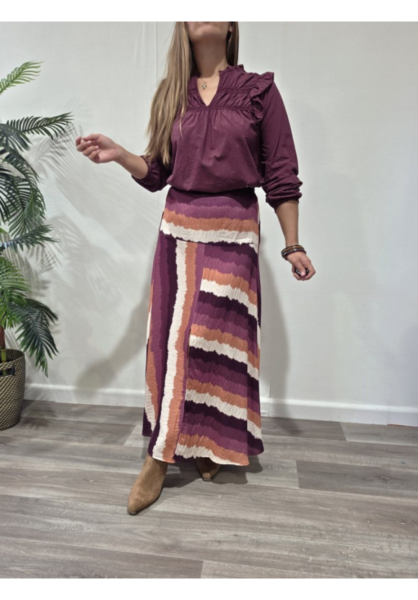 Blusa con puntilla en el escote y vuelo en el hombro. Escote de pico. manga larga con rizo en el puño.