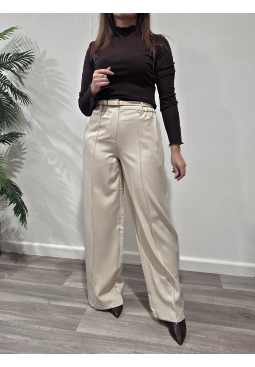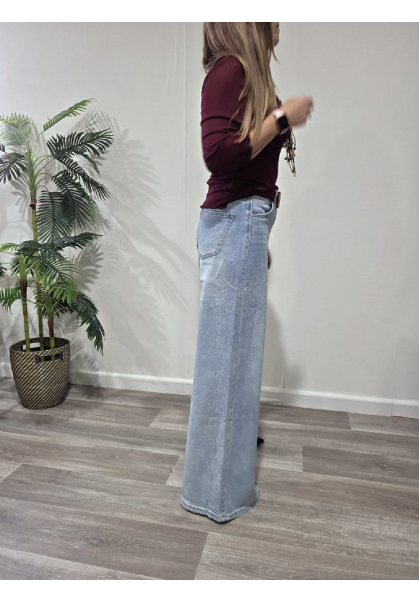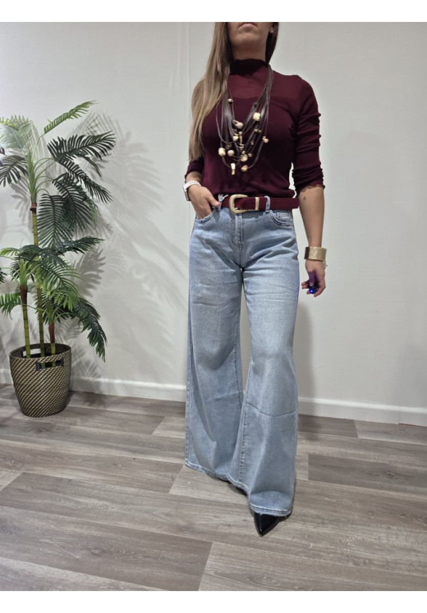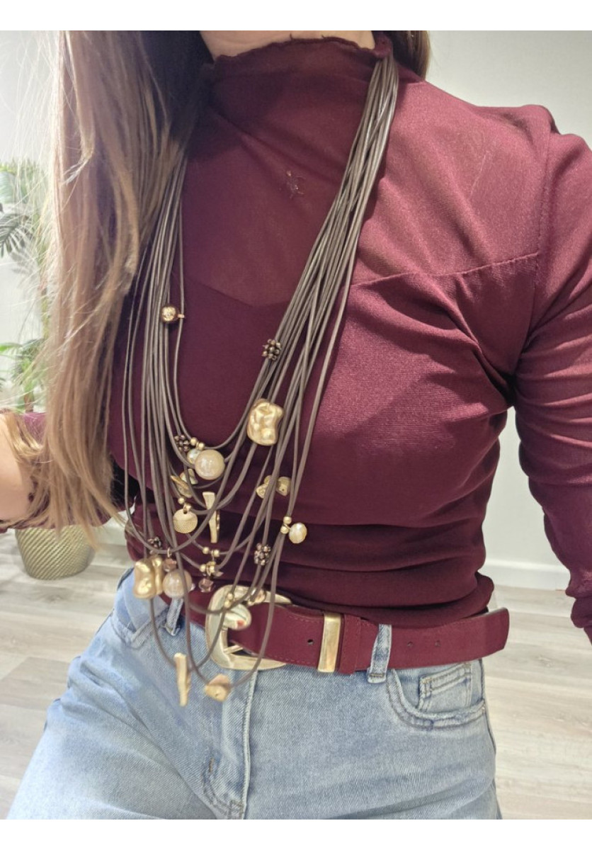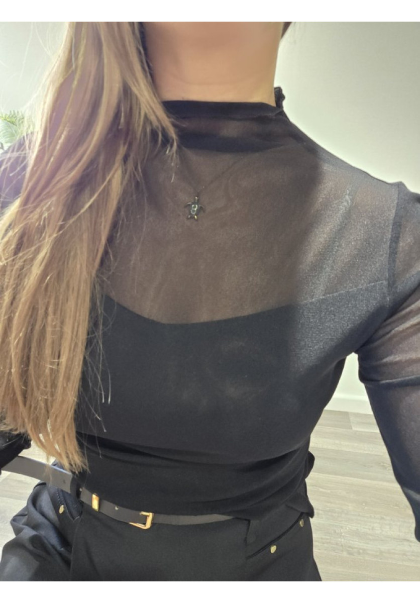 Camiseta de tul con cuello cisne y escote con transparencia. Bajo tupido.