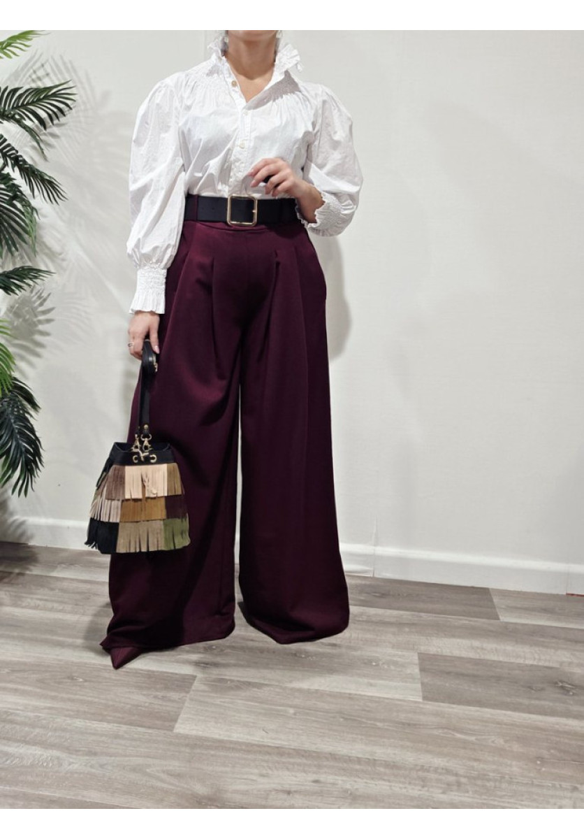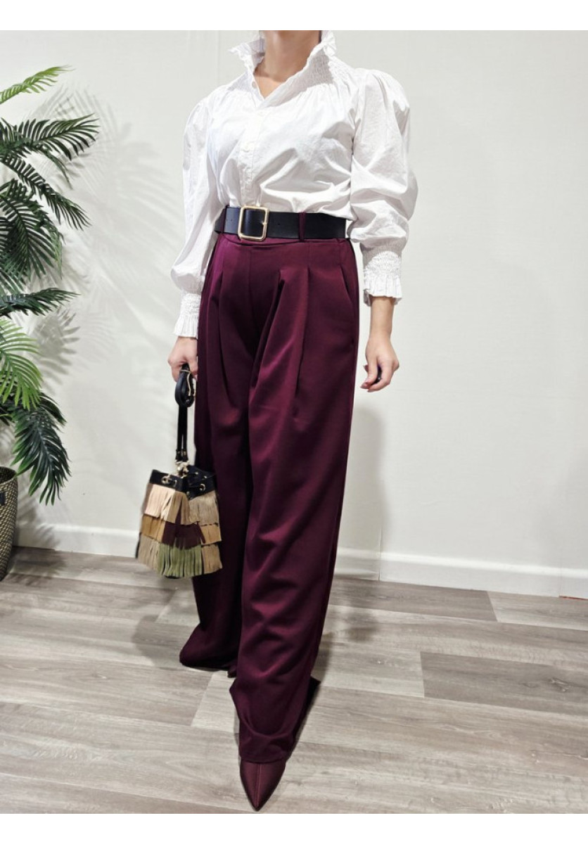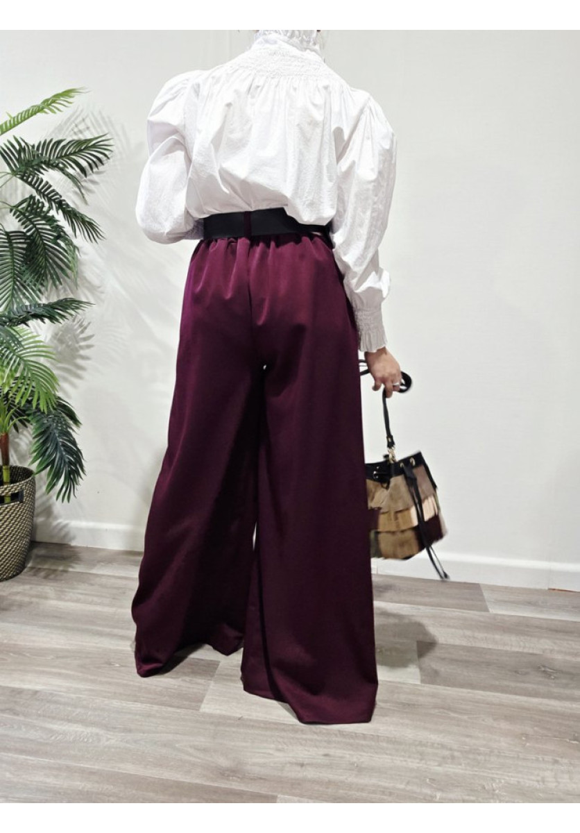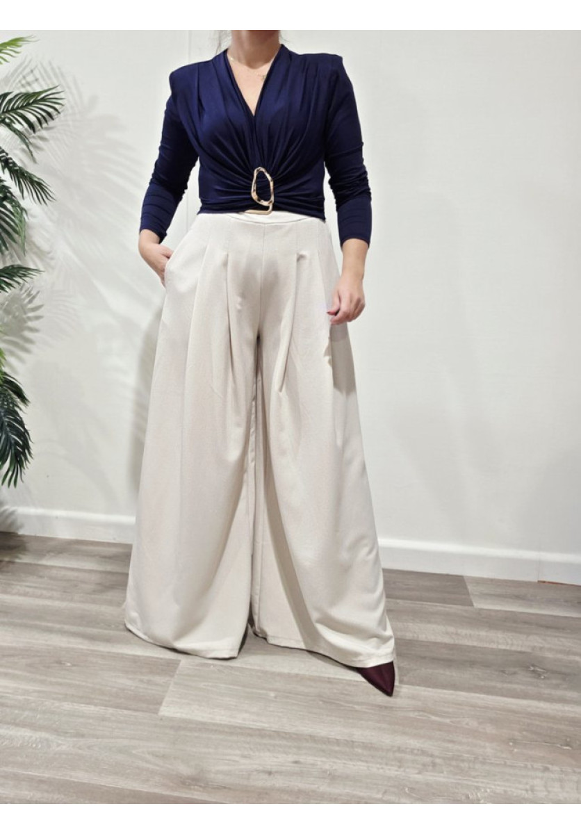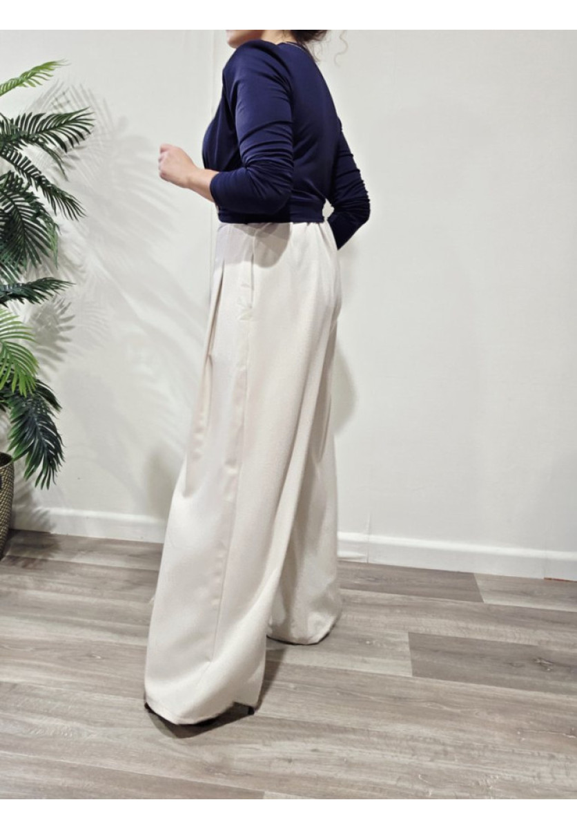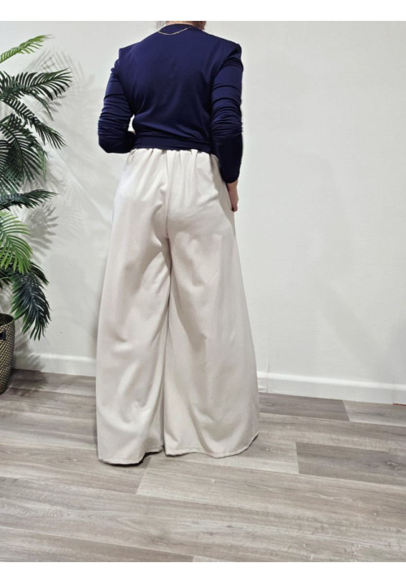 Pantalón palazzo con cintura lisa y pinzas bajas. Cintura trasera elástica.