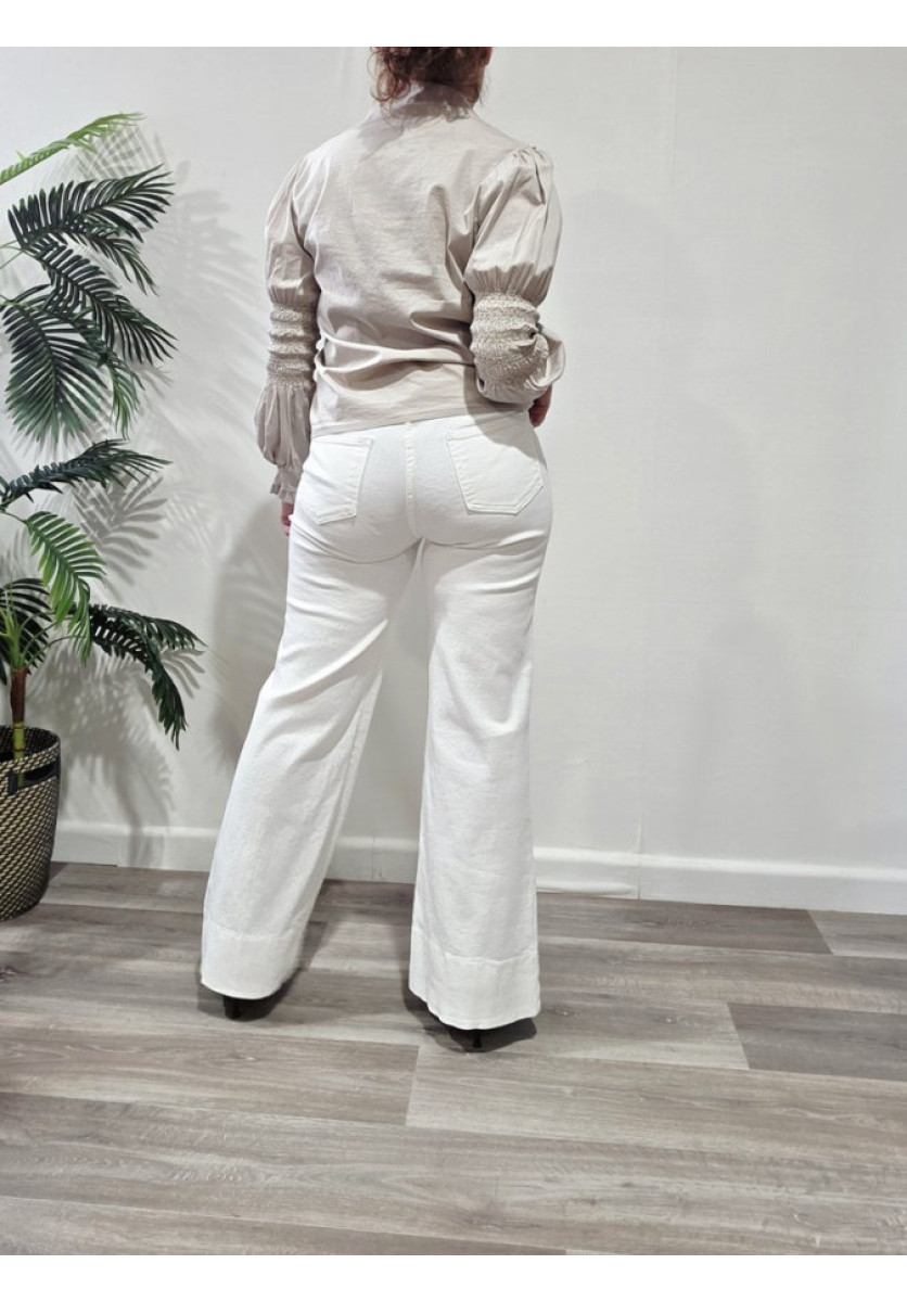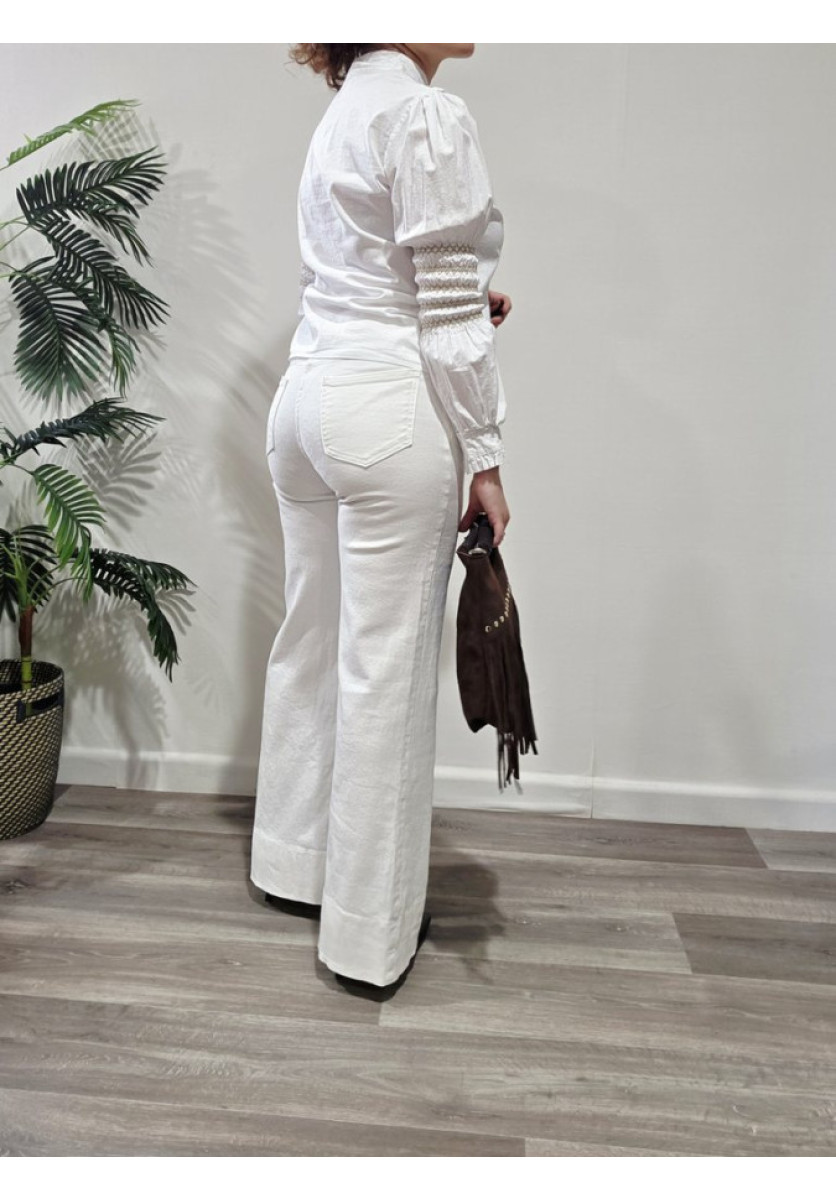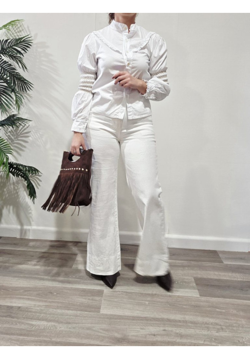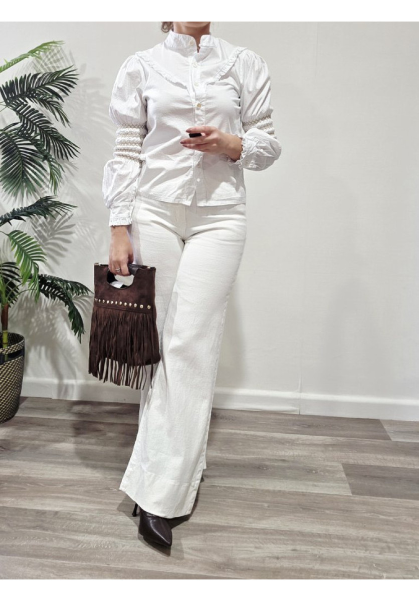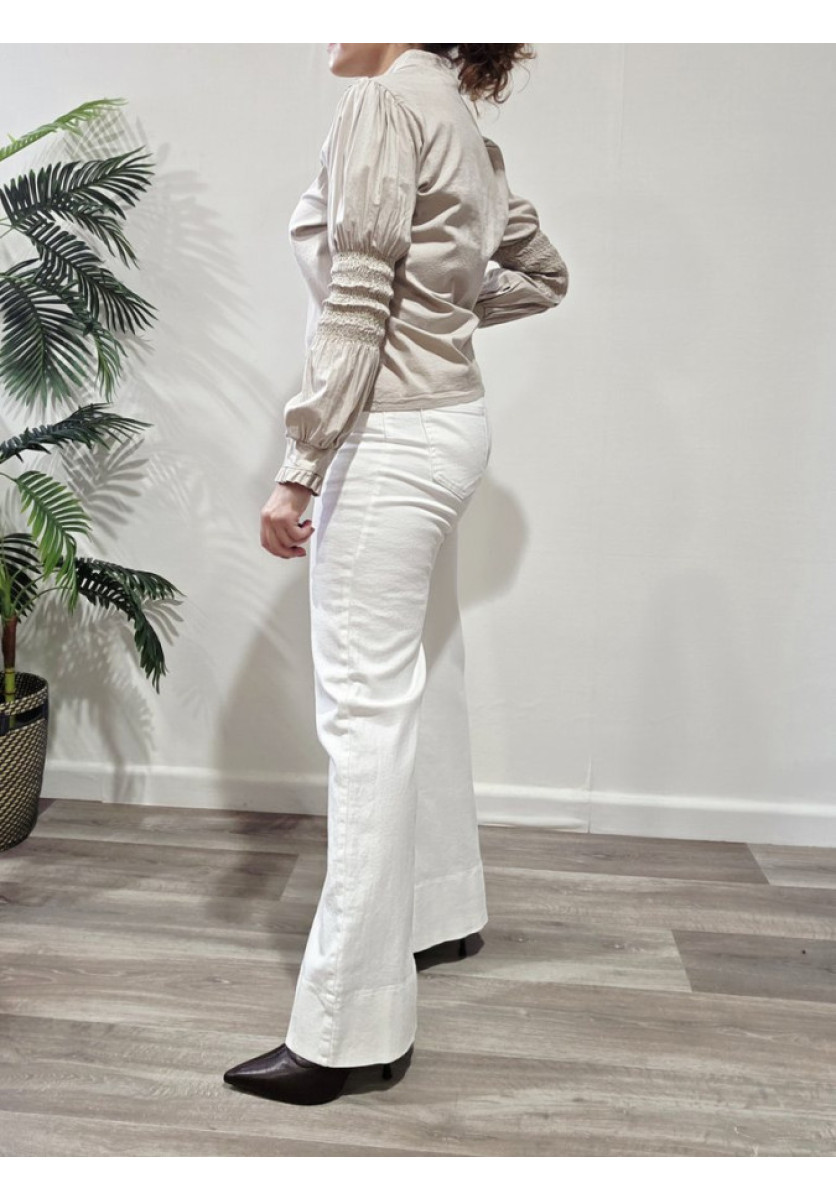 Blusa con pico en el escote cerrado y nido en las mangas con hilo dorado.