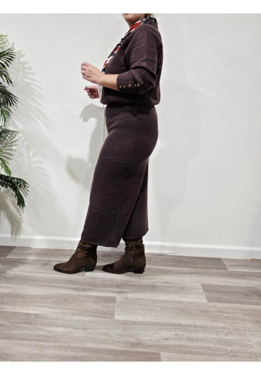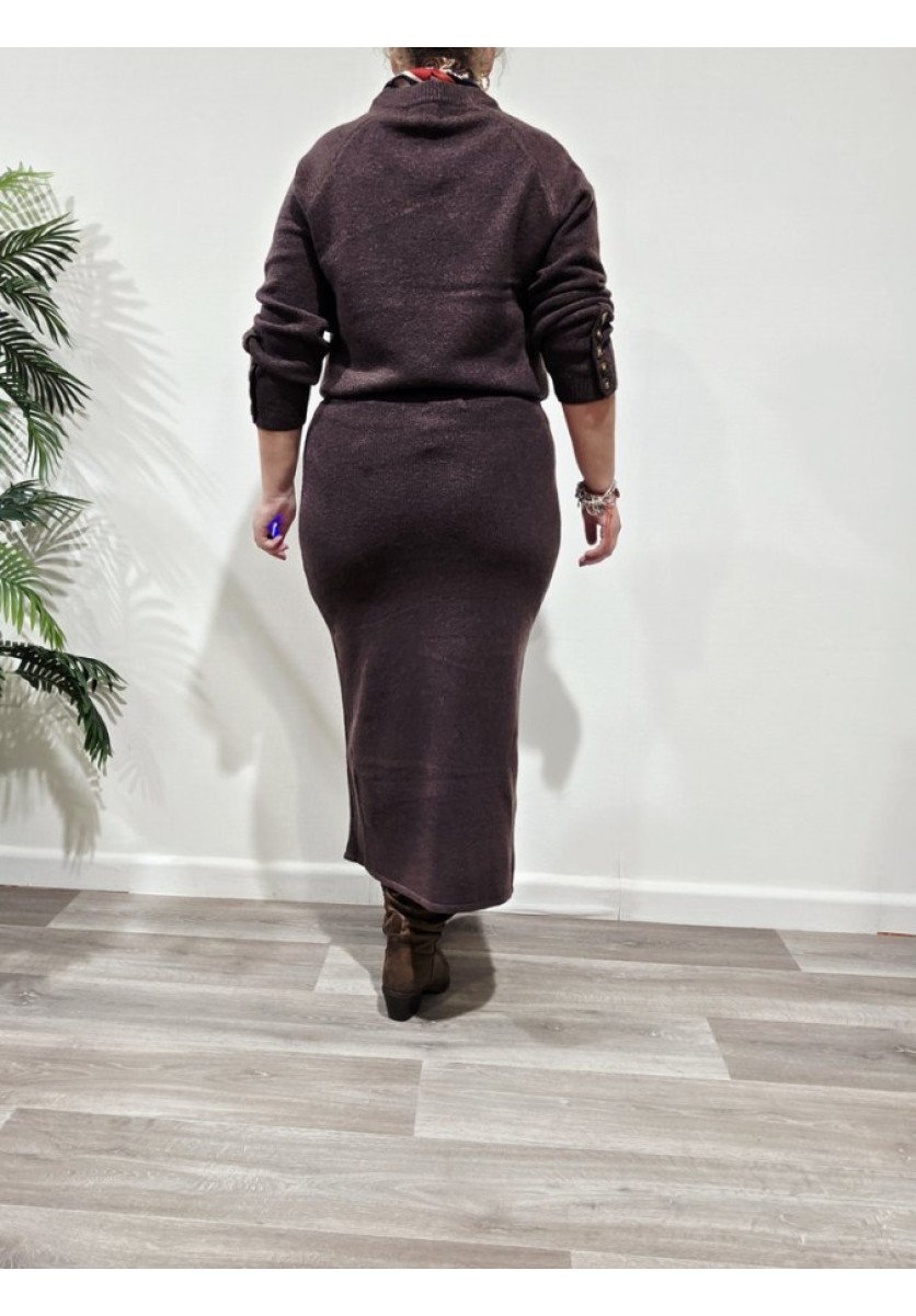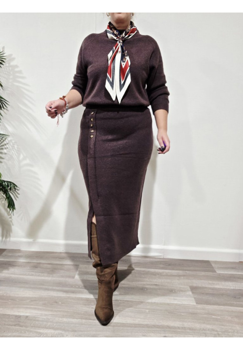 Conjunto de lana de jersey de manga larga con botones y falda pareo con abertura y botones decorativos.
