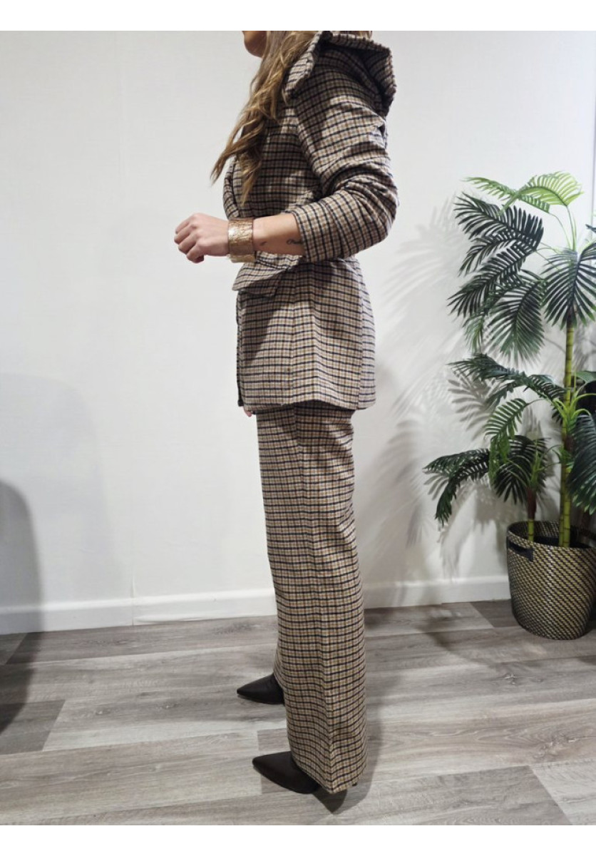 Pantalón de paño con cuadros. Corte recto con bolsillos. Cierre por botón y cremallera.