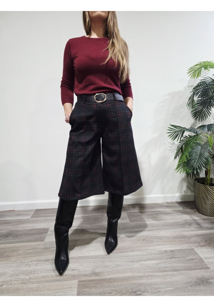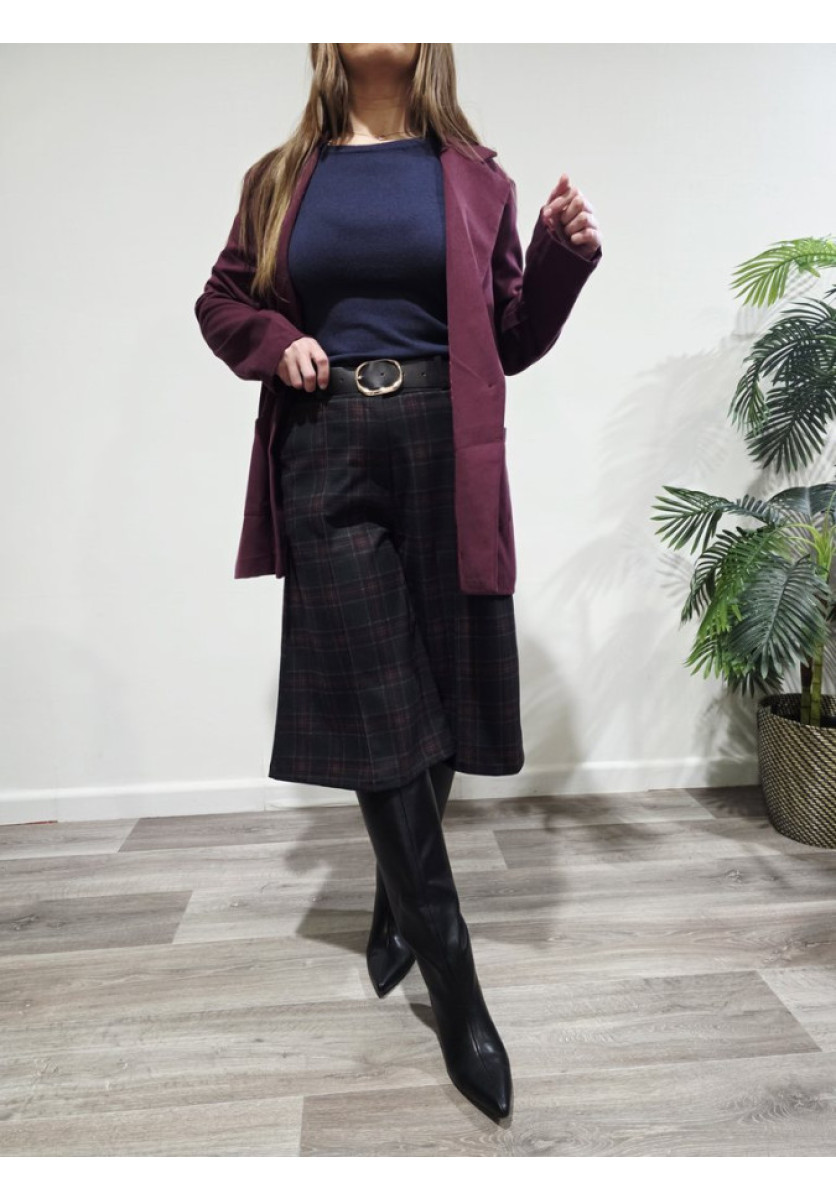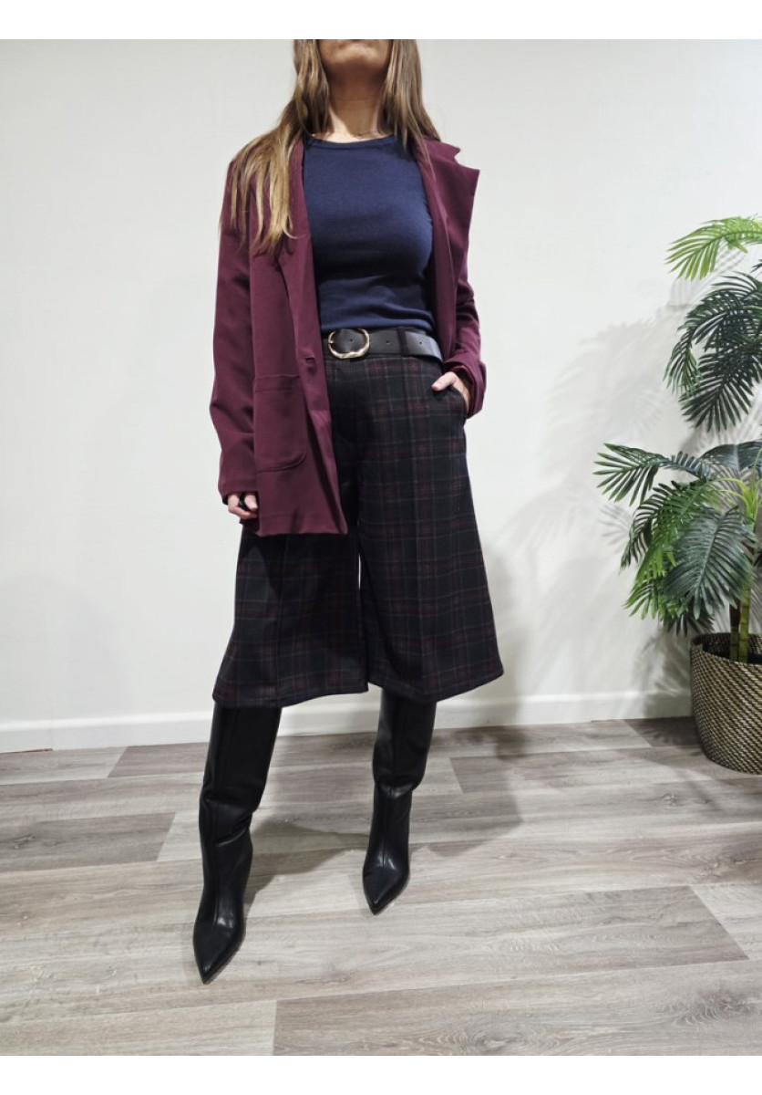 • Estampado de cuadros en tonos verde oscuro, burdeos y negro.