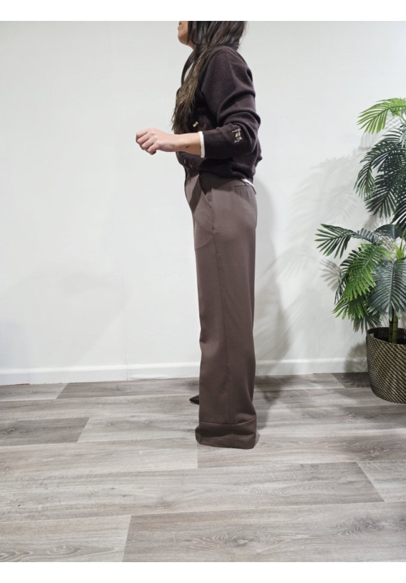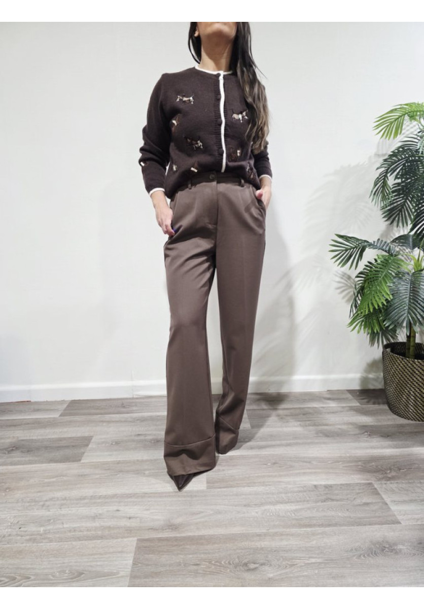 Cardigan de punto suave en color marrón chocolate, con detalle de ribete contrastado en blanco en cuello, frontal y bajo. Diseño con bordados decorativos de perritos repartidos por toda la prenda. Cierre frontal con botones forrados a tono. Manga larga y corte recto. Tejido confortable y de tacto agradable. Ideal para looks casuales de temporada. Disponible en talla única.