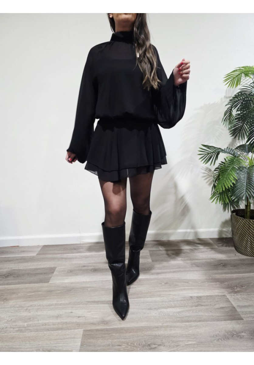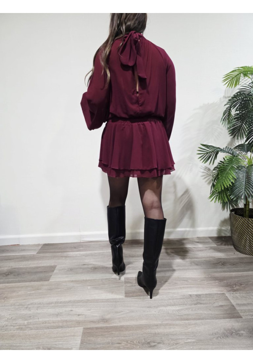 Mono fluido disponible en tono burdeos y negro. Diseño con cuerpo efecto gasa semitransparente y manga larga amplia. Cuello alto con lazada al tono en la parte delantera. Cintura elástica para mejor ajuste. Parte inferior con falda-pantalón fluida de doble capa con caída suave. Tejido ligero y cómodo. Talla única adaptable. Ideal para eventos, cenas y ocasiones especiales.